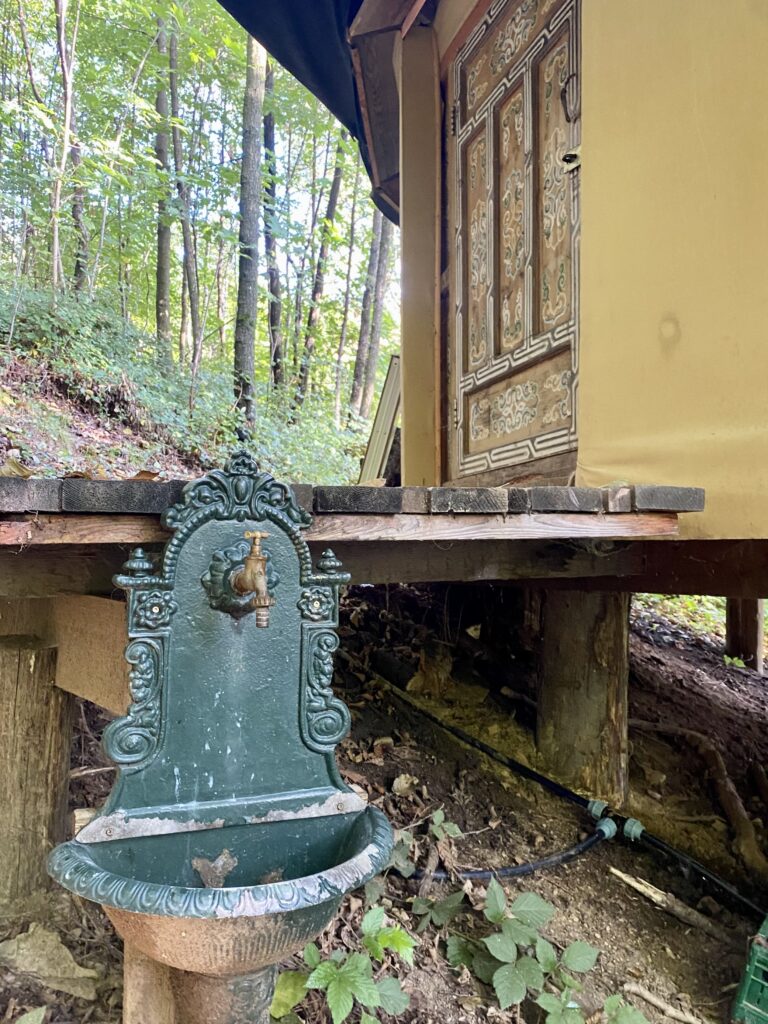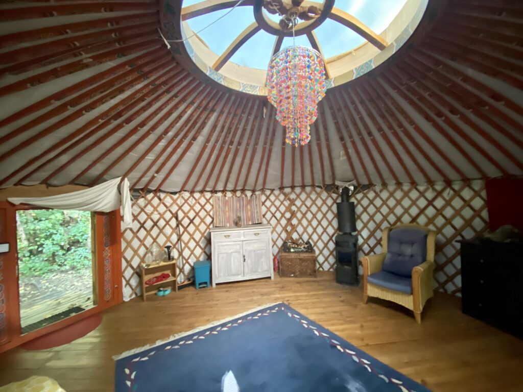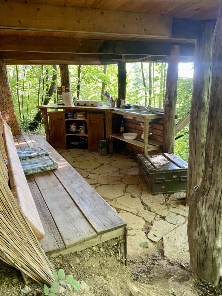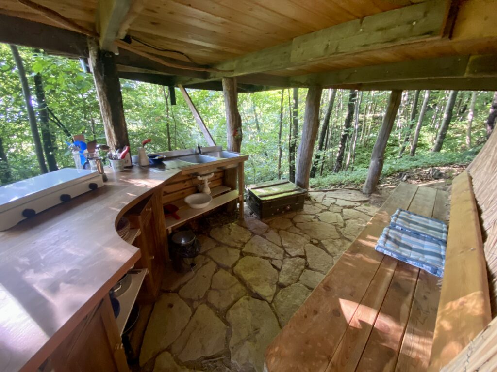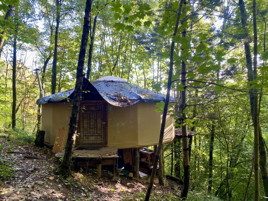 Unser beliebtester Platz ist die Jurte im Wald. Im mongolischen Stil mit original Rahmenkonstruktion und Tür, wurde sie auf eine wunderbare Plattform gestellt, um eine Terrasse erweitert und – ganz besonders – mit einer Außenküche unterhalb der Plattform versehen.