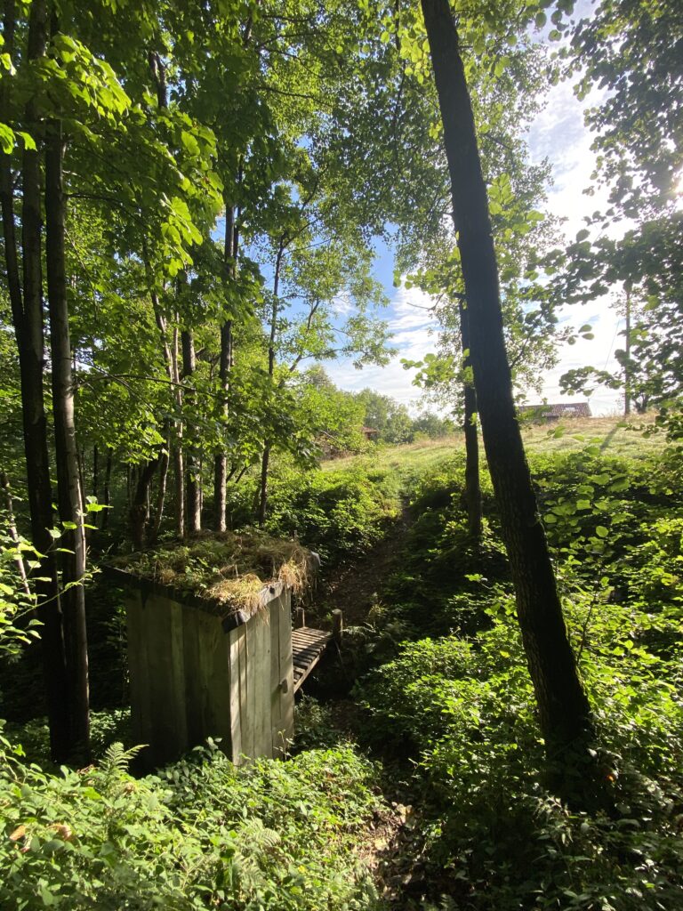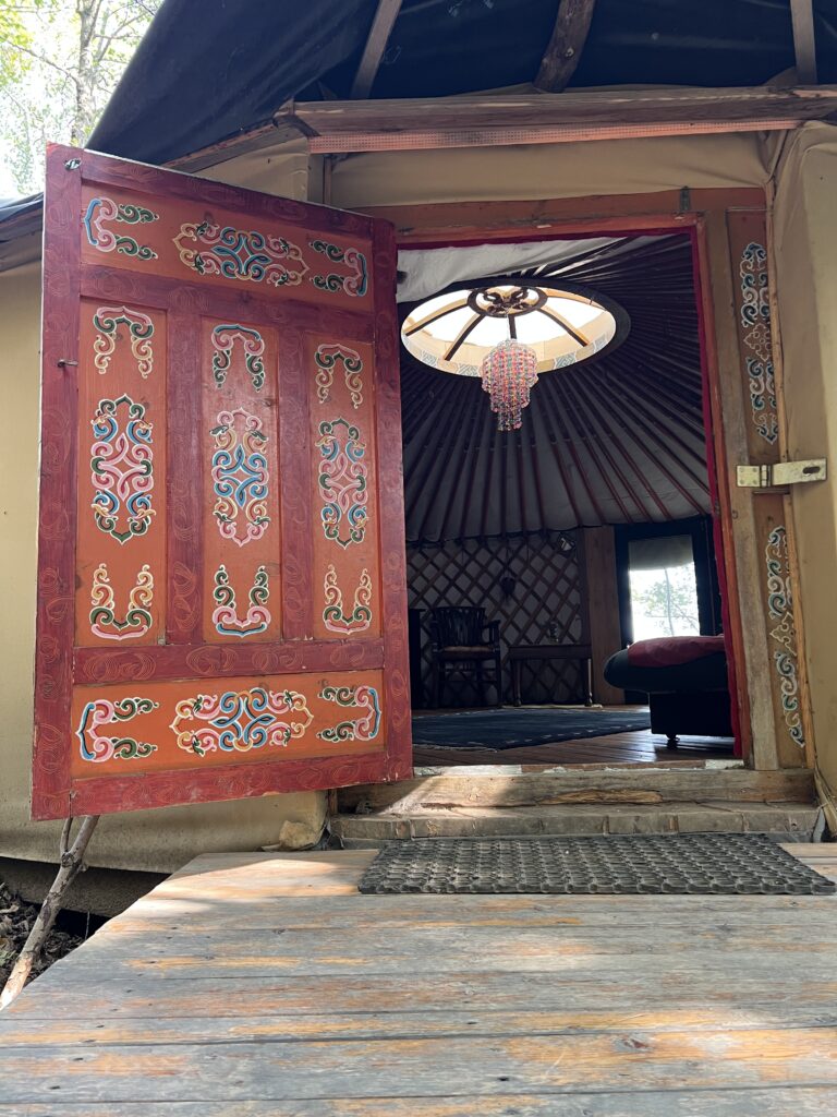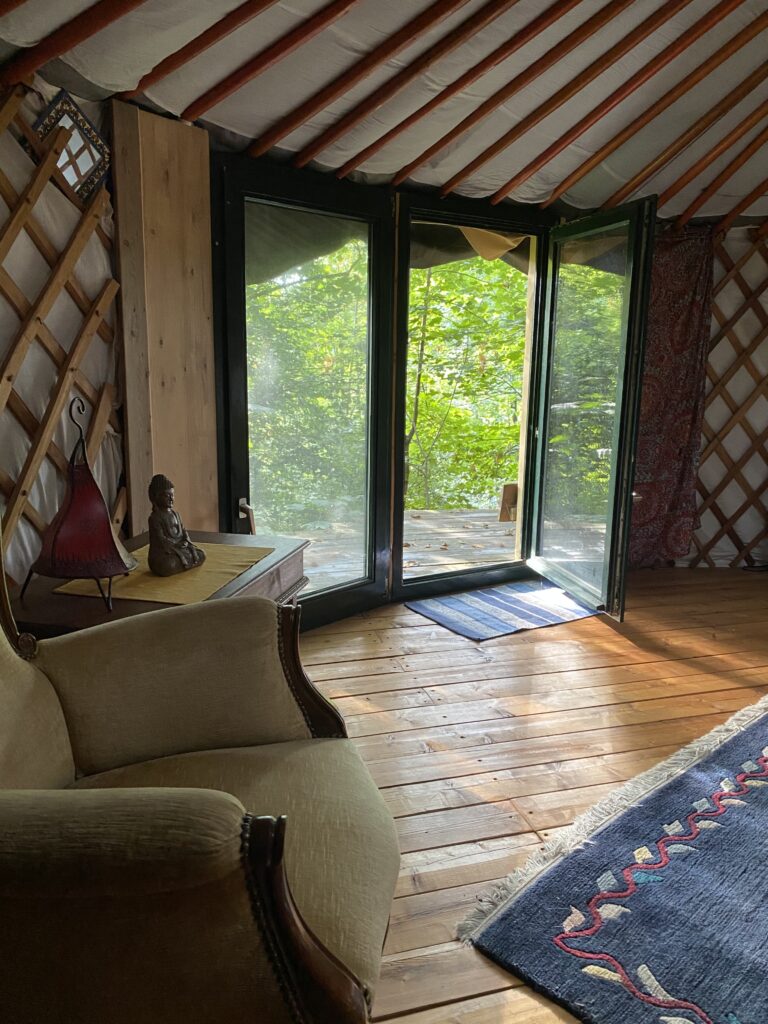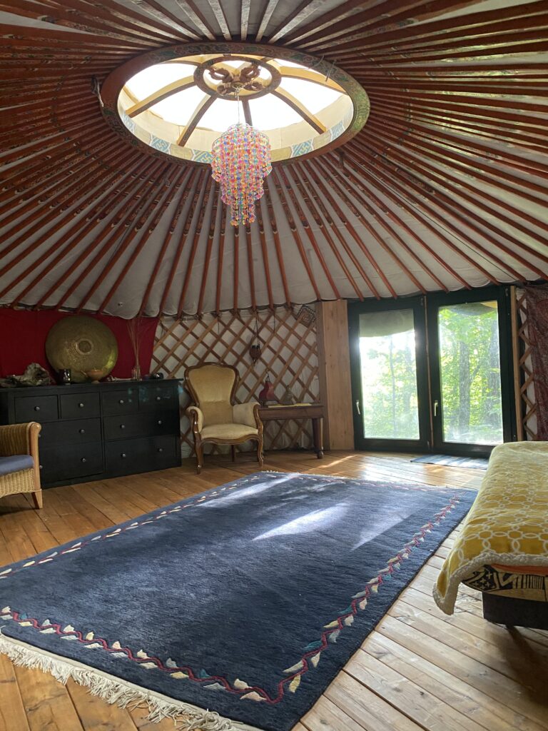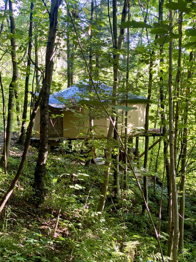 Unser beliebtester Platz ist die Jurte im Wald. Im mongolischen Stil mit original Rahmenkonstruktion und Tür, wurde sie auf eine wunderbare Plattform gestellt, um eine Terrasse erweitert und – ganz besonders – mit einer Außenküche unterhalb der Plattform versehen.